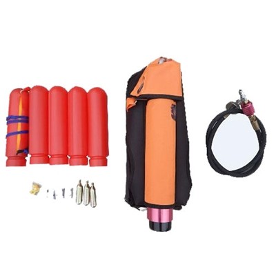救生抛投器只要由:枪体、救生绳、牵引绳、发射器、发射器瓶、自动充气装置、救生圈、塑料保护套等组成。