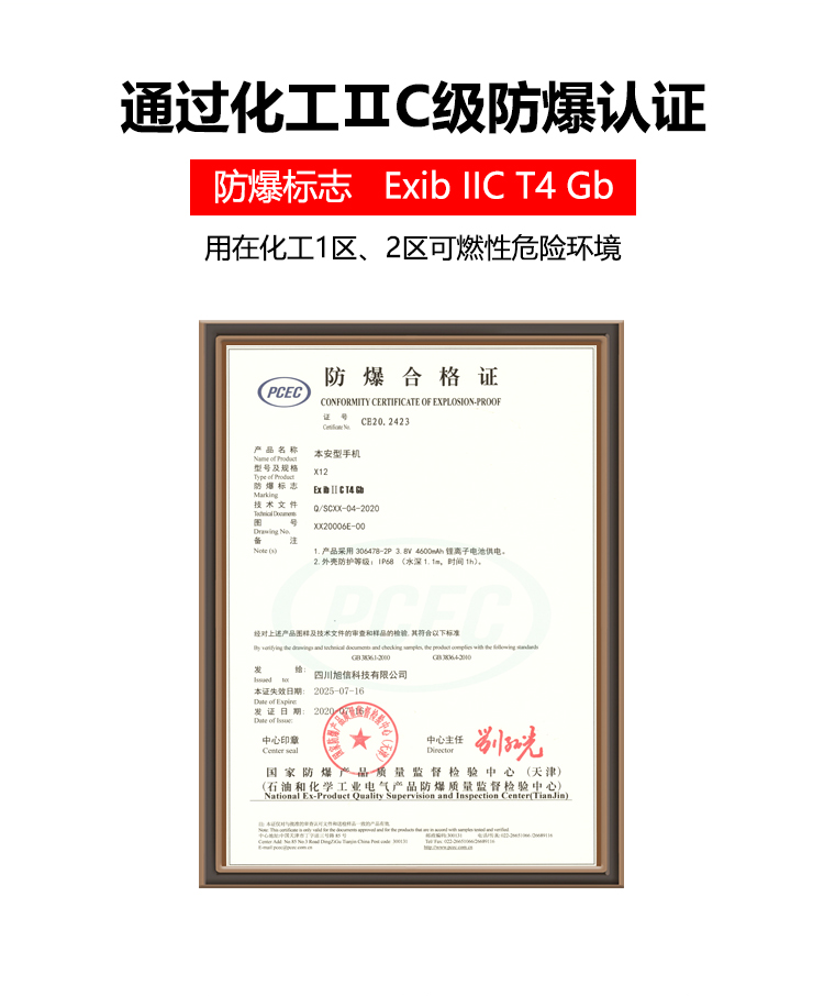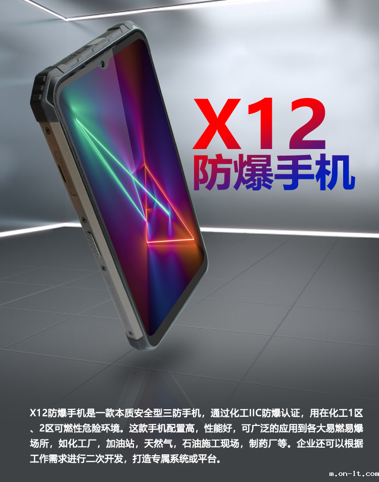 X12防爆手机是一款本质安全型三防手机,通过化工IIC防爆认证,用在化工1区、2区可燃性危险环境。这款手机配置高,性能好,可广泛的应用到各大易燃易爆场所,如化工厂,加油站,天然气,石油施工现场,制药厂等。企业还可以根据工作需求进行二次开发,打造专属系统或平台。